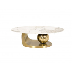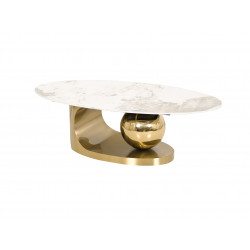 Original coffee table with a gold base, in the shape of a geometric spatial block. The oval white top is an imitation of marble. The modern form perfectly matches white marble and gold.