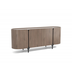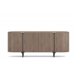 A minimalist walnut-colored sideboard with a visible wood grain. The metal base and accents are black. The body has rounded sides and rounded fronts.