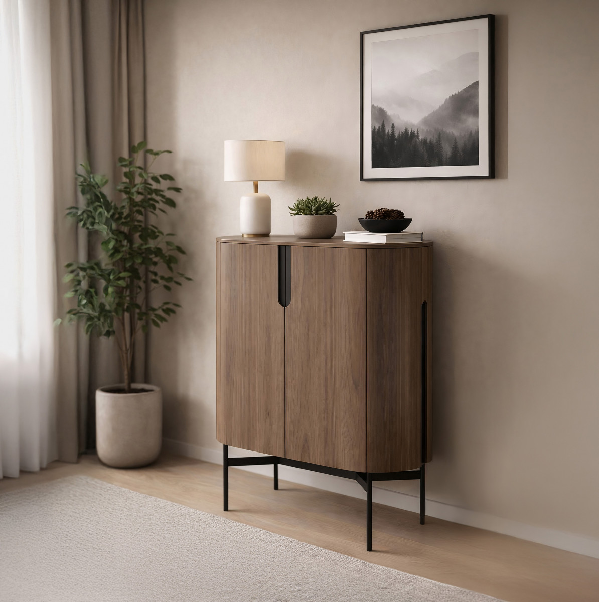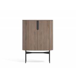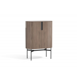 A modern walnut-colored highboard with visible wood grain. The metal base and accents are black. The streamlined lines are accentuated by arched details.