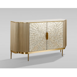 Oryginalna komoda w kolorze szampańskiego złota z frontem wykonanym z naturalnej muszli układającej się w symetryczny wzór. Korpus posiada ryflowane drewno oraz blat z wykończeniem marmurowym.