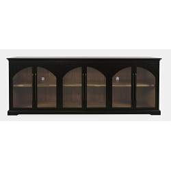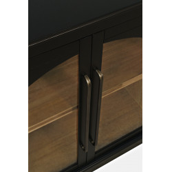 Komoda w kolorze czarnym, posiada sześcioro przeszklonych drzwi z ozdobnymi łukami oraz eleganckie podłużne uchwyty. Prosta forma przełamana jest frezowanymi krawędziami i widocznej strukturze forniru.