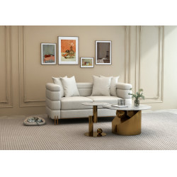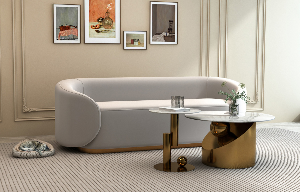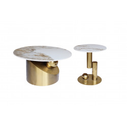 Oryginalny zestaw stolików kawowych z podstawą w kolorze złotym, w kształcie geometrycznej bryły przestrzennej. Okrągły biały blat jest imitacją marmuru. Nowoczesna forma idealnie współgra z białym marmurem i złotem.