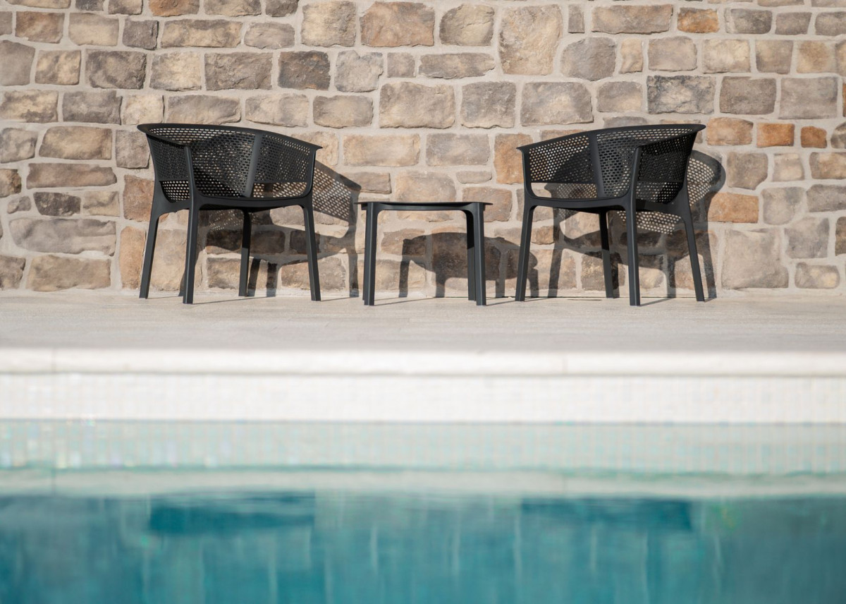Kolekcja NEXO NEXO to kolekcja inspirowana architekturą, łącząca wyrazistą formę z codziennym komfortem. Jej znakiem rozpoznawczym jest rytmiczny układ perforacji, który nadaje lekkości i nawiązuje do modernistycznych oraz współczesnych fasad. Śmiała, a jednocześnie funkcjonalna, sprawdza się w przestrzeniach prywatnych i publicznych, wewnętrznych i zewnętrznych. Kolekcja obejmuje fotel, krzesła z podłokietnikami i bez, hoker oraz stół. Każdy element łączy ergonomię, dopracowaną estetykę i trwałość, oferując płynne linie, wygodne kształty i ponadczasowy charakter.
